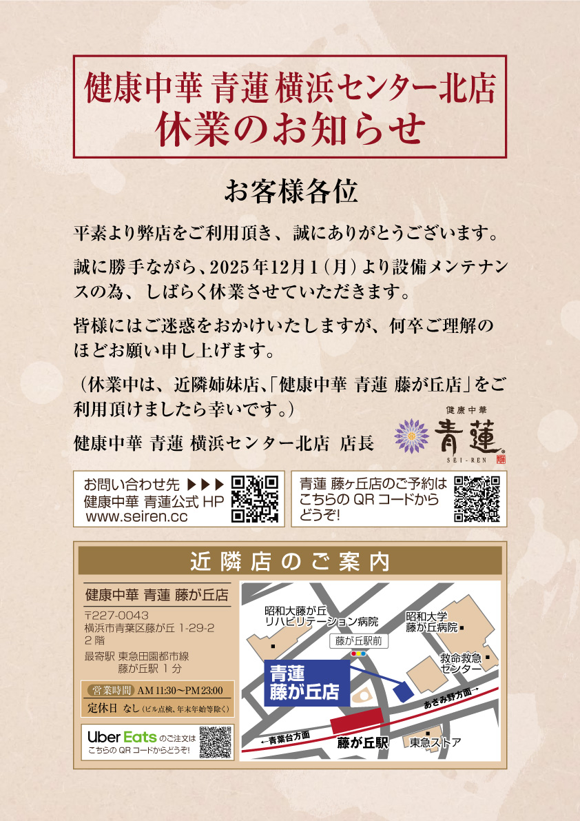 【休業および閉店のお知らせ】 平素よりご利用いただき、誠にありがとうございます。 誠に勝手ながら、2025年12月1日(月)より設備メンテナンスのため休業しておりましたが、 この度、諸般の事情により 2026年1月31日をもちまして閉店する運びとなりました。 長きにわたりご愛顧いただきましたお客様には、心より御礼申し上げますとともに、 突然のご案内となりましたことを深くお詫び申し上げます。 近隣の姉妹店 「健康中華 青蓮 藤が丘店」 をご利用いただけましたら幸いです。 これまで支えてくださった皆様に、スタッフ一同、心より感謝申し上げます。 |